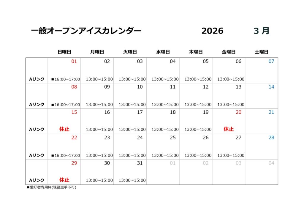 ・平日120分/2,000円 ・日曜日60分/2,000円 平日のライフコース受講者様は、レッスン日の一般オープンアイスも終日ご利用いただけます。事前に窓口への申し込みが必要です。