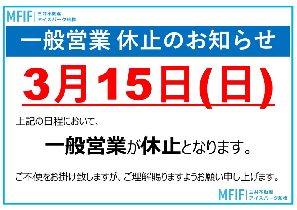 ホーム新着情報3月15日(日)一般営業 休止3月15日(日)一般営業 休止2026年03月06日お知らせ3月営業カレンダーに記載していた通り、一般営業は休止となります。ご不便をお掛けいたしますが、ご理解賜りますようお願い申し上げます。前へ一覧に戻る